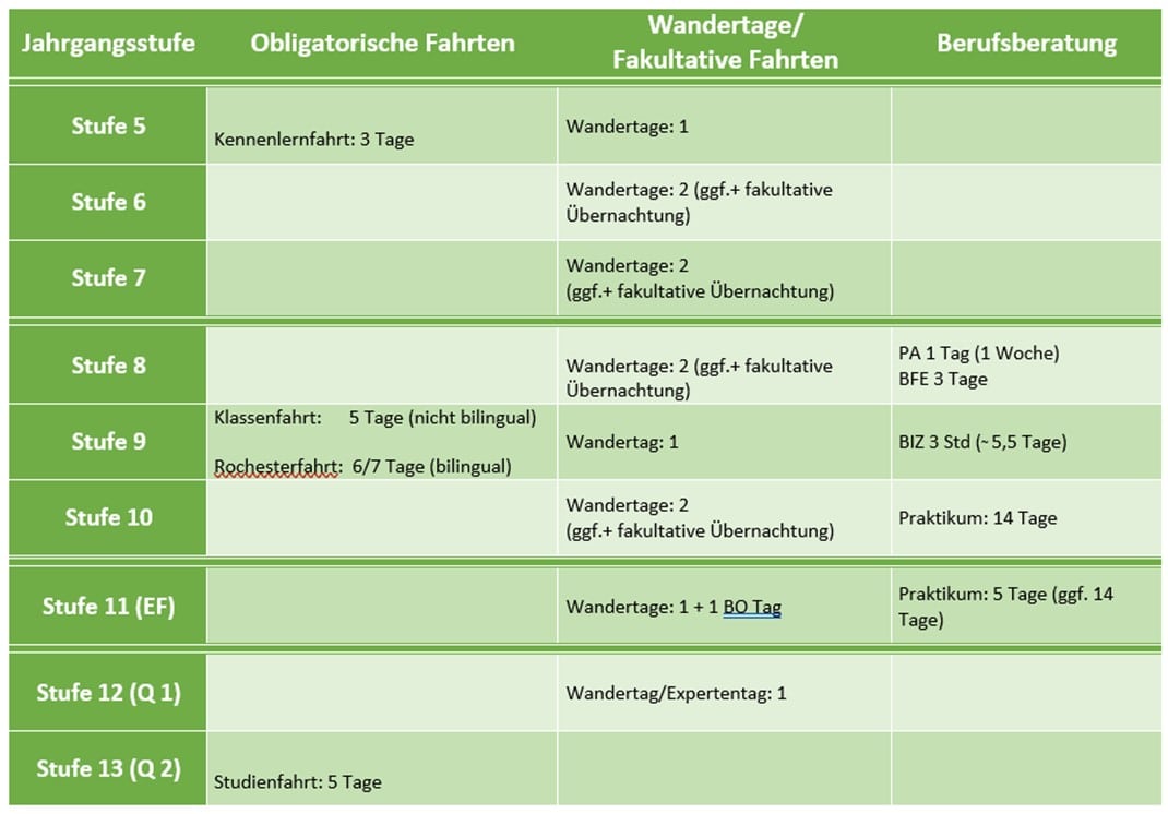 Je Schuljahr gibt es 2 zentral festgelegte Wandertage für die Jahrgangsstufen, in denen keine Fahrt stattfindet. Die Kosten sollten hierbei zusammengerechnet maximal zwischen 25 und 30 Euro für beide Fahrten betragen. In Jahrgängen in denen Klassenfahrten angesetzt sind, ist jeweils ein Wandertag im Schuljahr veranschlagt. Zusätzlich zu diesen festgesetzten Wandertagen kann jeweils eine fakultative Verlängerung durch eine Übernachtung für die Klassen 5, 6 und 7, bzw., 8, 9 und 10 in den Jahrgängen, in denen keine Klassenfahrt stattfindet, beantragt werden. Der Kostenrahmen für 2 Wandertage inklusiver fakultativer Übernachtung, d.h. ein Wandertag ohne und ein Wandertag mit Übernachtung, soll nicht mehr als 50 Euro betragen.
