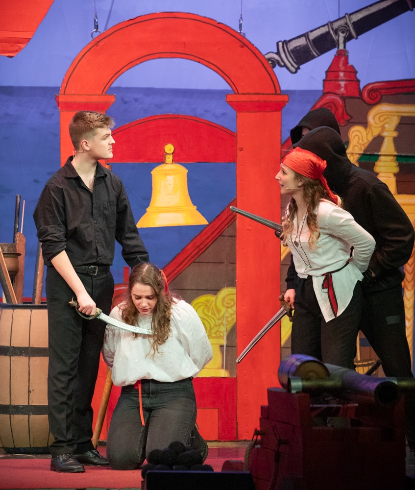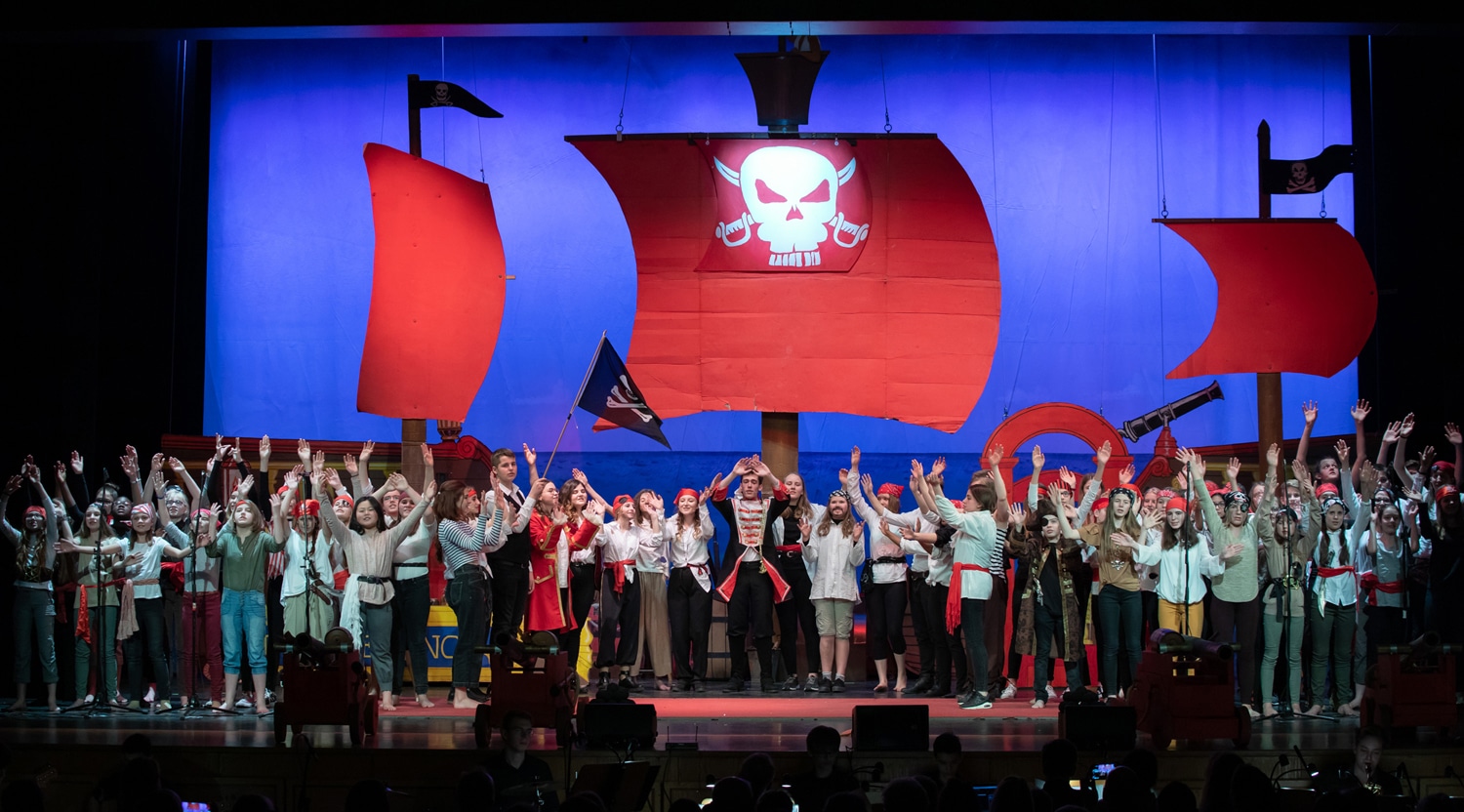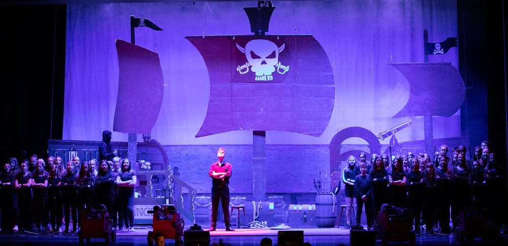 „Alles klar zum Entern!“, hieß es am zweiten Februarwochenende 2019 im Haus der Stadt: 1170 begeisterte Zuschauer sahen das Musical „Piraten“, das von 120 Schülerinnen und Schülern aller Jahrgangsstufen aufgeführt wurde. Getragen wurde die Aufführung von dem 50-köpfigen Schulchor und einem engagierten Schauspielensemble, das erstmals unter der Regie von Janina Uerlings agierte. Die Hauptrollen teilten sich dabei Jennifer Melcher und Aleyna Toprak in der Rolle der Kaufmannstochter Nancy, Jens Tribbels als Marienoffizier William sowie Vanessa Groß und Lena Stückgen in der Rolle der Sklavin Minerva.